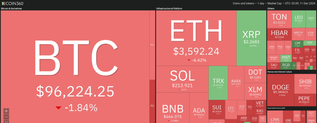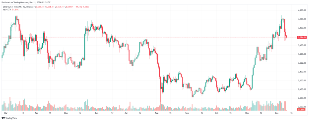 Đặc biệt, Ethereum (ETH) cũng không thoát khỏi đợt điều chỉnh này. Sau một cú sốc mạnh vào ngày 09/12, ETH tiếp tục gặp khó khăn trong hai ngày sau đó với mức giảm hơn 2%. Giá ETH đã đóng cửa hàng ngày ở mức $3,626, nhưng sự gia tăng áp lực bán đã khiến giá quay trở lại dưới mốc $3,600.