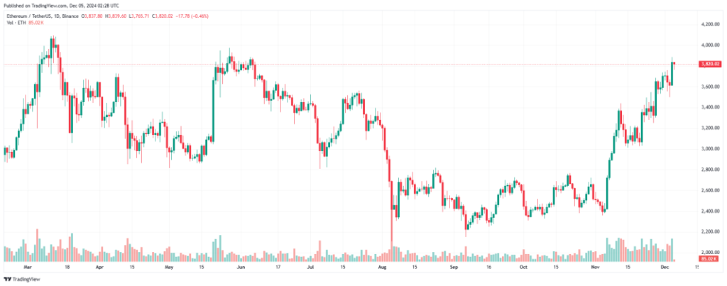 Ethereum (ETH) cũng đã có sự phục hồi tốt khi tăng 6% trong phiên giao dịch vừa qua, đạt mức giá 3.887 đô la – đây là mức cao nhất kể từ cuối tháng 5 năm 2024. Người đầu tư hiện đang cố gắng giữ giá trên ngưỡng 3.800 đô la với hy vọng vào một đợt tăng trưởng đột phá sắp tới.