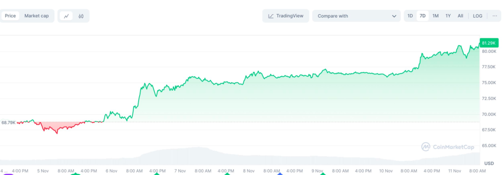 Tình hình hiện tại cho thấy, với sự hỗ trợ của các yếu tố vĩ mô như kỳ vọng về sự điều hành kinh tế thân thiện hơn từ chính quyền mới và khả năng Fed cắt giảm lãi suất, Bitcoin đang có xu hướng tiếp tục thiết lập các mốc cao mới. Tài sản hàng đầu này đã ghi nhận mức tăng khoảng 40% trong tháng, và nếu đà tăng này tiếp tục, mức 100.000 USD sẽ không còn là một ngưỡng khó khăn.